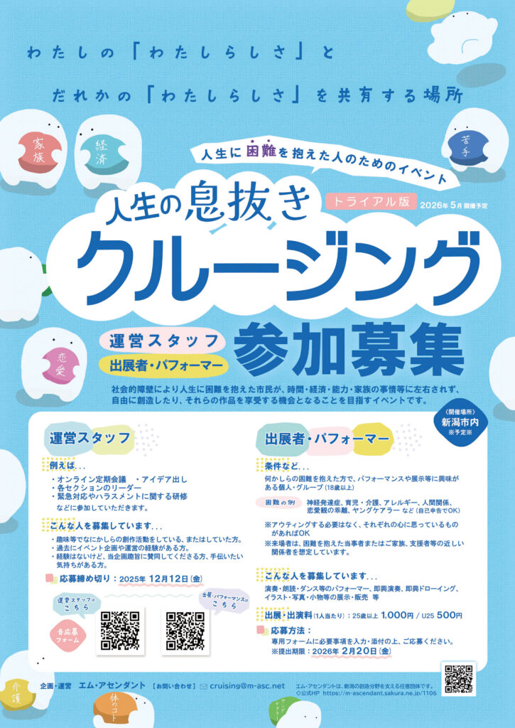 社会的障壁により人生に困難を抱えた市民が、時間・経済・能力・家族の事情等に左右されず、自由に創造したり、遠慮なく作品を享受する機会となることを目指すイベントです。